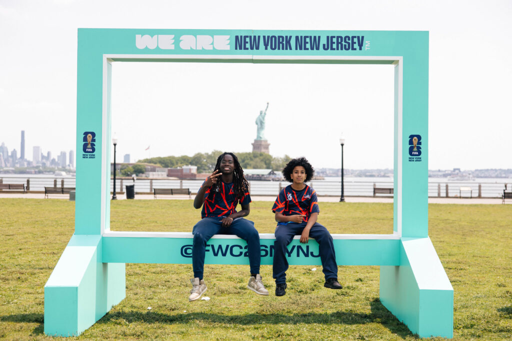 Dos niños con camisetas de fútbol junto a un cartel que dice: “Somos Nueva York Nueva Jersey” en inglés. Foto: Comité Anfitrión de la Copa Mundial de la FIFA 2026 de NYNJ.