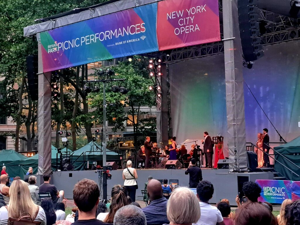 Es jueves, 26 de junio, a las 19:00 horas, en el céntrico Bryant Park, en el midtown de Manhattan. El evento, gratuito y patrocinado por Bank of America, consiste en dos días con las estrellas de la ópera de Nueva York. Se presenta bajo el título “La ópera va a Hollywood”, como parte del programa “Actuaciones de picnic”, que incluye conciertos gratuitos durante todo el verano con géneros musicales tan variados como el flamenco y el jazz afrolatino.