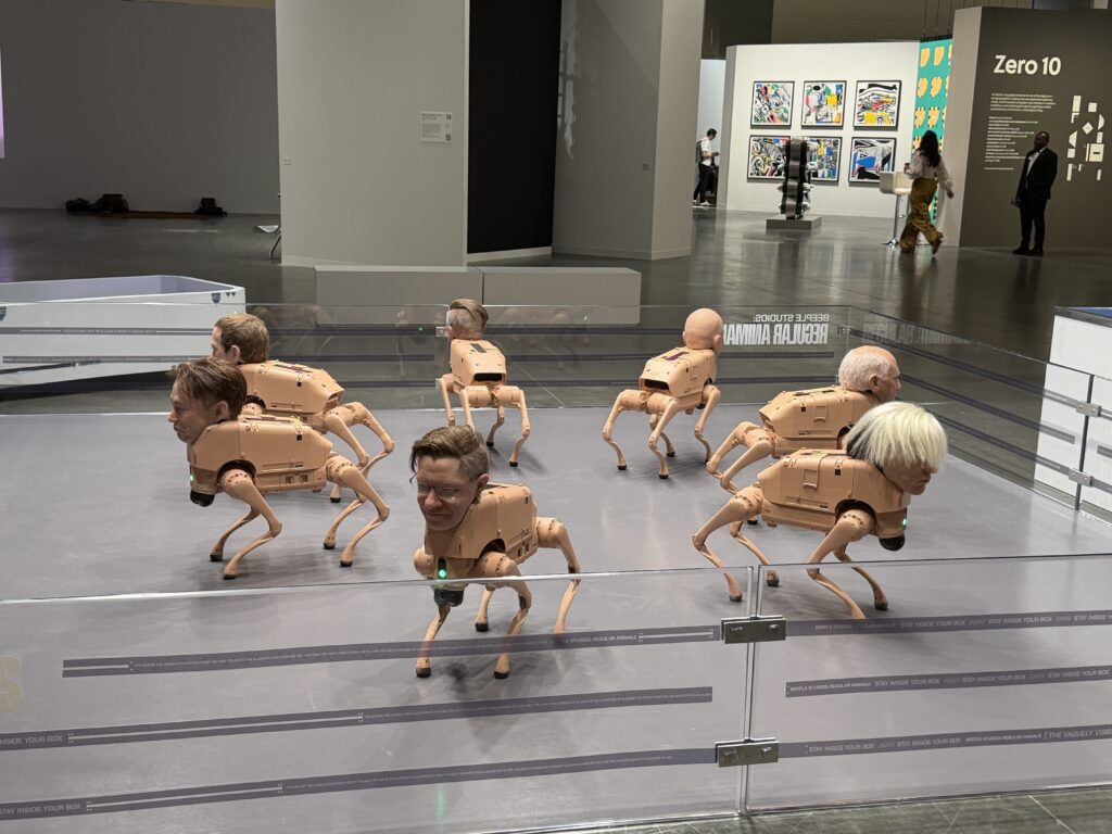 Aterradoramente realistas y portadores de un mensaje poderoso, los robots perro del artista digital Mike Winkelmann (más conocido como Beeple), presentados en Art Basel en Miami Beach esta semana, han acaparado todas las miradas de la célebre feria internacional de arte. Elon Musk, Mark Zuckerberg, Jeff Bezos, Pablo Picasso, Andy Warhol y el propio creador de la exhibición, Beeple, son los genios del arte y la tecnología convertidos en mitad humanoides, mitad robots caninos, que anticipan un futuro distópico… y que defecan arte.