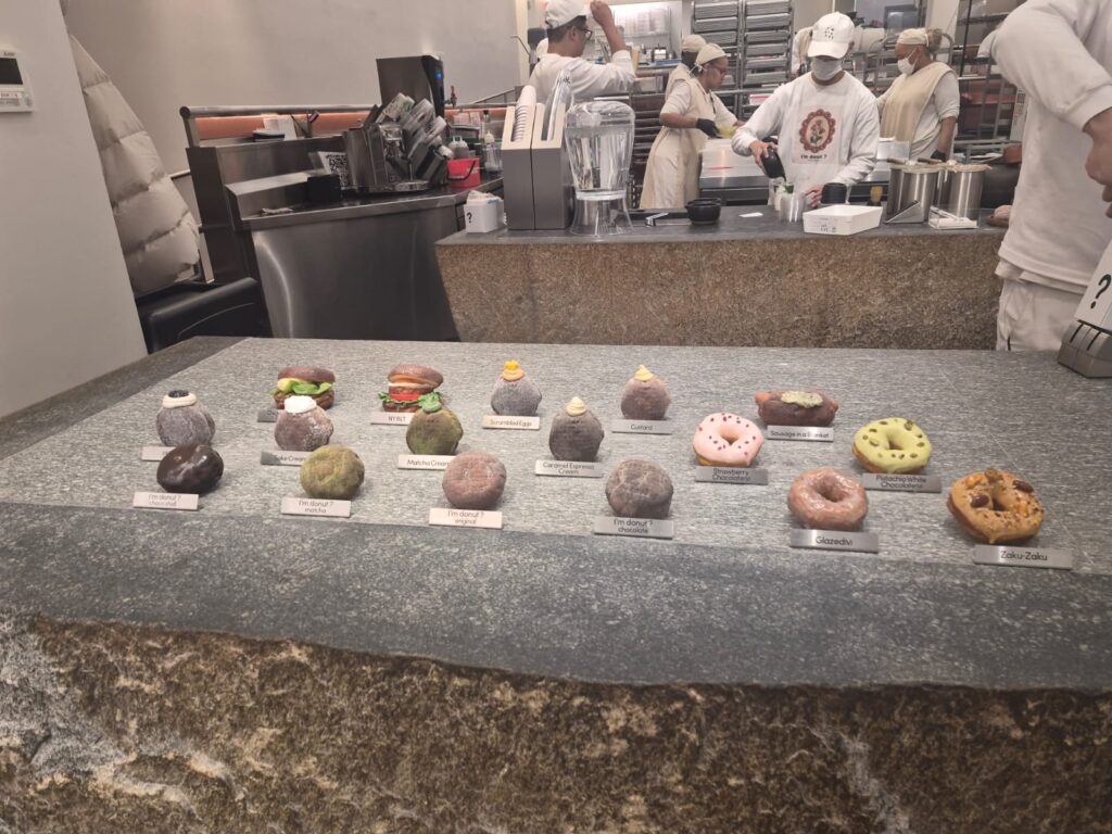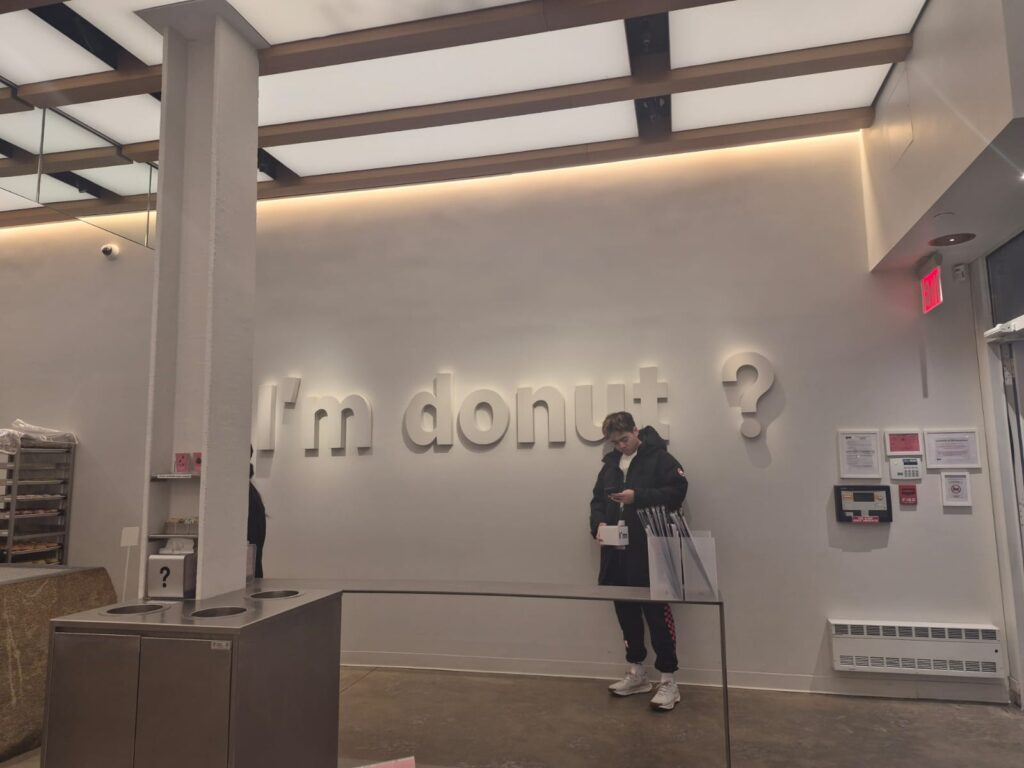 El nombre del lugar deja una pista ambigua: “I’m donut?” (¿Soy un donut?), con interrogación, invitando a cuestionar la respuesta. En pleno Times Square (calle 45 con la Séptima Avenida), los productos de I’m donut?, tanto dulces como salados, conservan la esencia del donut pero incorporan ingredientes que los alejan kilómetros de la versión tradicional.